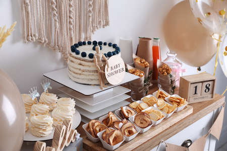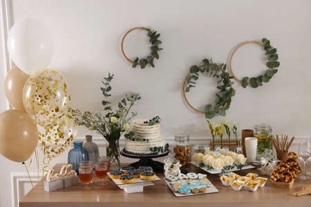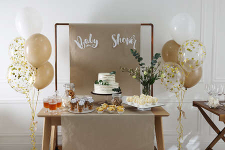 baby shower party. Different delicious treats on wooden table and decor near light wall