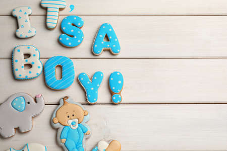 Phrase It is a boy, tasty cookies and space for text on white wooden table, flat lay. baby shower party