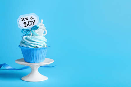 Beautifully decorated baby shower cupcake with cream and boy topper on light blue background. Space for text
