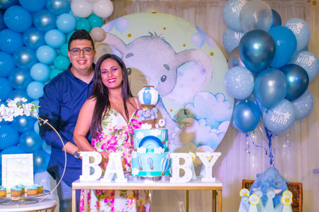 Family celebrating baby shower at home with balloons and joyful conversations. Celebration, party, happiness, occasion, gathering, togetherness