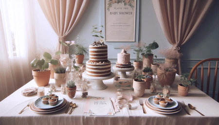 Celebrating baby shower, women with balloons and cake, sharing joyful moments together. Celebration, party, dessert, friendship, maternity