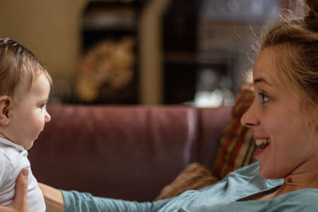 Mother engaging with her baby, holding and smiling while sitting in a cozy, well-lit living room with natural decor and furniture around