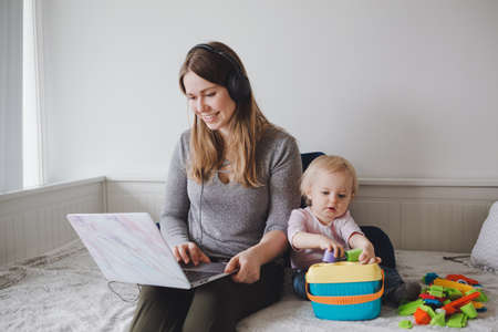 Young Caucasian mother blogger with baby working on laptop from home. Workplace of freelance woman student with kid toddler. Stay at home single mom earning money at online job.