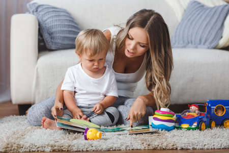 young pregnant mother with dreadlocks, and her son play and reading a book, lifestyle, real interior toning