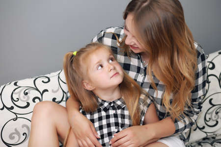 Mother and daughter on bed at home. Happy family.