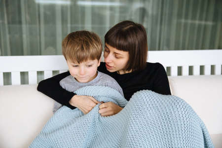 Mother and her cute little boy sitting on a sofa