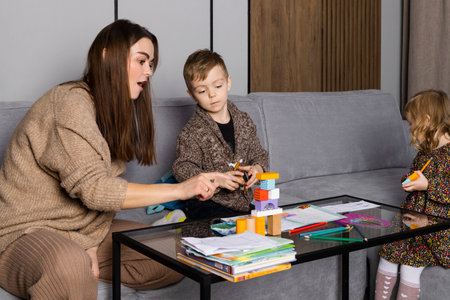 Mother or nanny playing with the siblings, spending their time together, drawing in a living room. happy family.