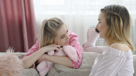communication conversation. girlfriends at home chatting. young infantile teenage girls talking