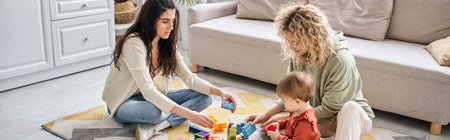 merry lesbian couple playing with their baby girl with toys on floor at home, family concept, banner