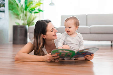 a happy mother with baby reading book