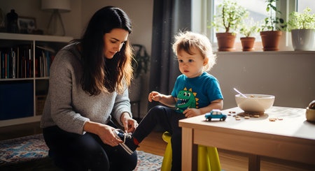 A loving mother kneels on the floor to help her toddler son put on his sneakers in a sunlit living room. The scene captures a tender moment of parenting and the morning routine of getting ready for the day.