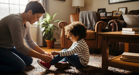 A caring mother kneels on the floor to tie the red sneakers of her curly-haired child in a bright and cozy living room.