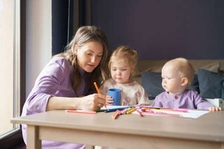 Young loving mother drawing with colored pencils with two adorable little kids at home. Happy mom teaching small daughter and baby boy son how to draw. Motherhood and mothers day concept