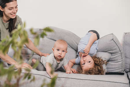 Cute siblings playing on the sofa. Toddler sister with baby brother cuddling up with mother at home. Plant on foreground, light flat, Livingroom. Family spending time together with fun