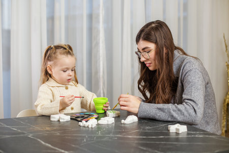 Clay figures. Spending time together. Mom teach toddler girl paint clay figures, having fun relax on table in living room at house.