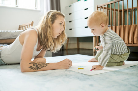 Baby, mama and learning drawing on paper in home, bonding and coloring. Education, art and mother teaching child for creative development, growth and homeschool, homework and knowledge in house.