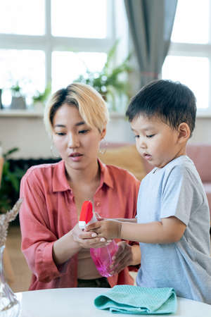 Cute little boy helping his mother with domestic chores while spraying detergent on duster