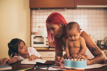 Kids with mother having fun at home by the table, creating hand made art. Children drawing and communicating on the kitchen emotional intellect. Learning to write, count, colors draw with big pencils