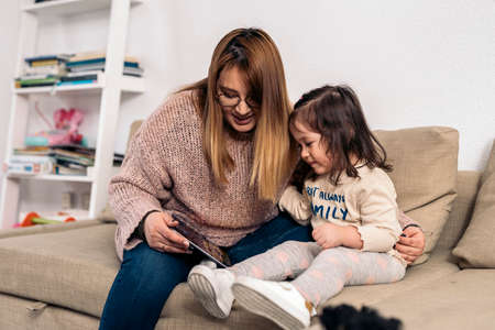 Stock photo of happy woman using tablet with her daughter in the living room.