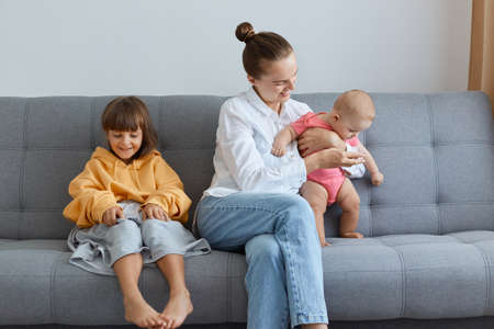 Portrait of young adult mother with her kids sitting on sofa and playing, woman spending her maternity leave with her cute little kids, elder girl wearing oversized attire.