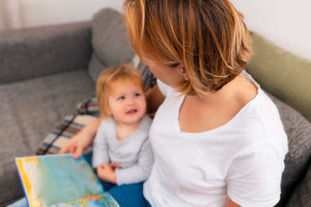 Mother and child are sitting together at home on the couch and reading a book. Top view. Defocused baby.