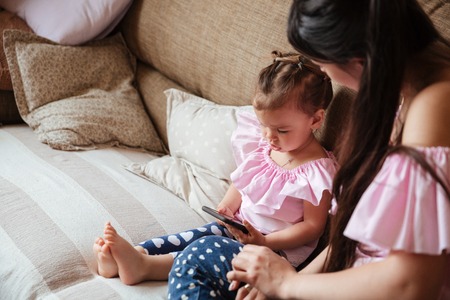 Picture of young serious mother sitting on sofa chatting by phone with her little daughter indoors. Looking aside.