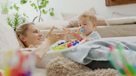 Happy smiling mom plays with her beautiful baby, with colorful educational learning toy, lying at home between pillows, healthy and cared for growth concept
