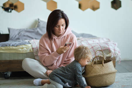 Young Caucasian mother with her son sitting on the floor next to the black sofa. Teleworking and caring for your child, a new normal after the coronavirus pandemic, covid-19. Watching the child play
