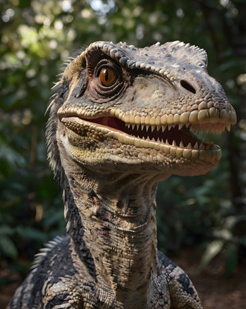 A detailed close up of a large dinosaur statue standing tall among the trees in a lush forest. The sunlight filters through the foliage, casting shadows on the prehistoric replica.