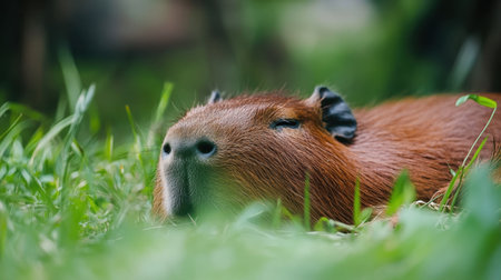 A capybara peacefully naps on the ground, surrounded by lush green grass, creating a serene atmosphere that showcases the beauty of nature.