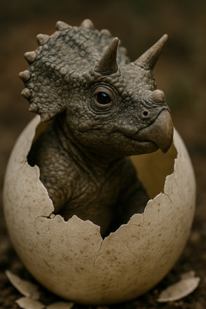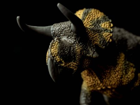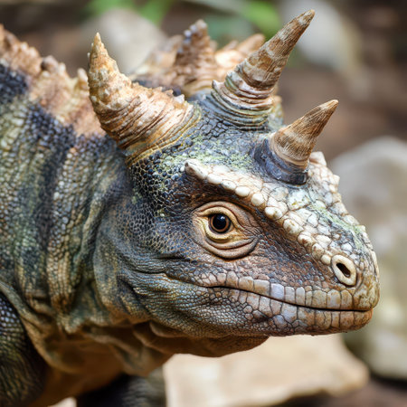 A stunning horned reptile gazes curiously at the viewer showcasing its intricate features and unique texture in a natural setting.