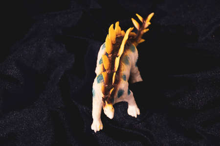 Photo A toy baby dinosaur on a dark background. Plastic toy