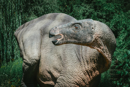 Close up of a stegosaurus dinosaur with open mouth. Dinosaur in the zoo.