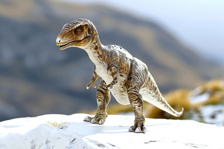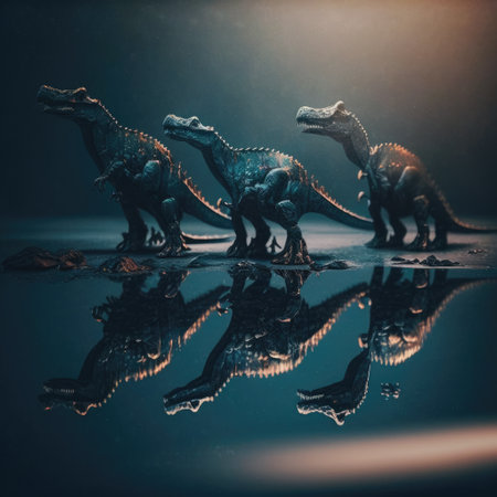 A couple of toy dinosaurs walking across a field. Generative AI image.