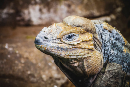 Portrait of a dinosaur iguana with open mouth. Close-up.