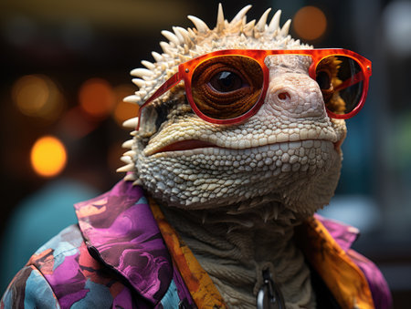 Funny and creative art: an iguana with glasses and a vivid jacket - generated by AI