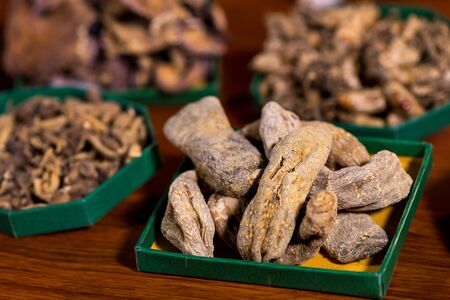 Various Chinese herbal medicines placed on a plate on a wood grain table
