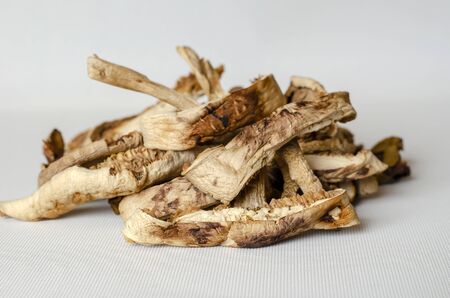 A pile of forest dried mushrooms closeup. Sliced mushrooms are fully prepared for further cooking. Dried food. Side view. Selective focus.