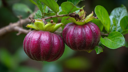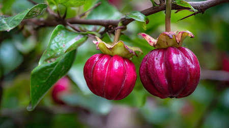 Two Garcinia gummi-gutta fruits hanging from a branch showcasing vibrant color.