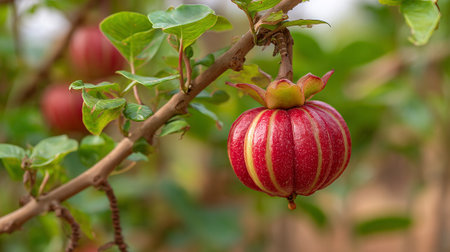 Vibrant Red Kokum Fruit Hanging Naturally from a Branch with Leaves