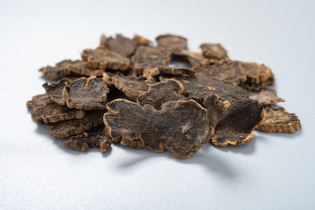 Dried lingzhi mushroom slices on white background
