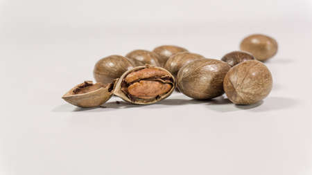 Revealing showing two halves of a cracked hazelnut shell revealing the smooth inner surface and textured exterior on a white background keywords:...