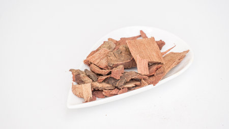 Cassia Fistula, Golden Shower tree bark, Khiar Shambar, Sonalu with Wooden mortar on white background. Ayurveda.