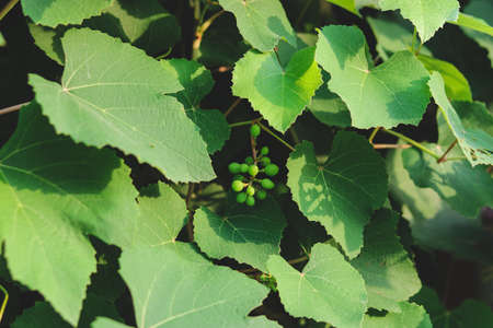 Close-up unripe green bunch of grapes in vineyard in early summer. Bunches of grapes before flowering. Shallow depth of field.