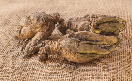 Three roots of incarvillea delavayi on canvas before planting in spring. Root in the foreground with a sprouted bud