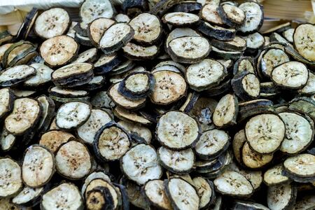 raw organic green bananas sliced spread to dry from soft sun bath on bamboo basket.