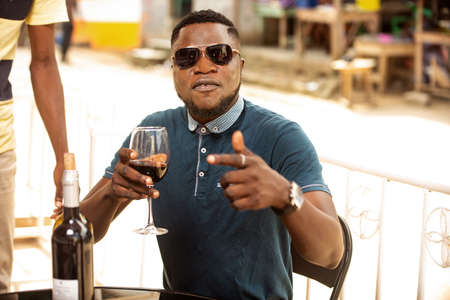 handsome young man wearing glasses and holding a glass of red wine while smiling