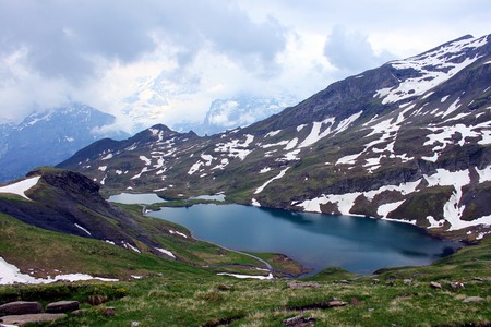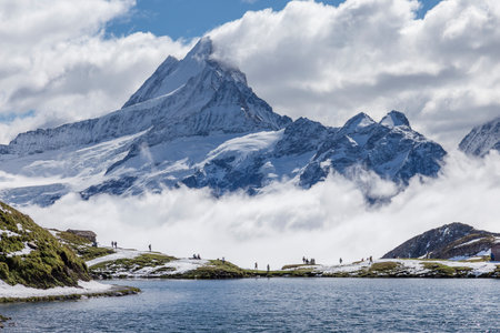 Bachalpsee lake with cloudy ,Schreckhorn and Wetterhorn at Grindelwald in Switzerland