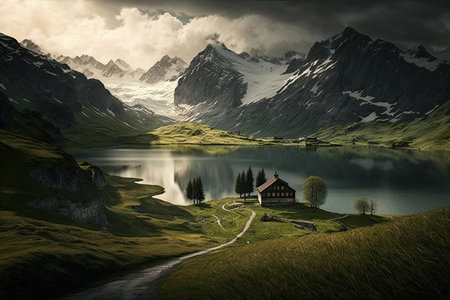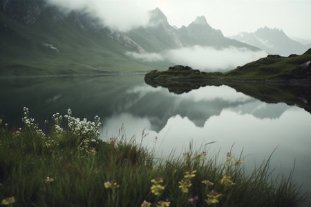 An AI generated illustration of a tranquil scene of a mountain lake with mountains in the background