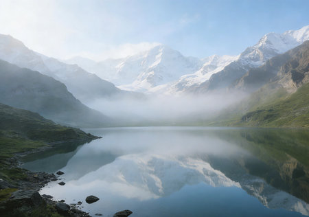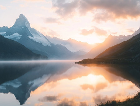 Iconic Matterhorn mountain peak mirrored in a tranquil lake during a breathtaking sunrise, with soft mist rising.